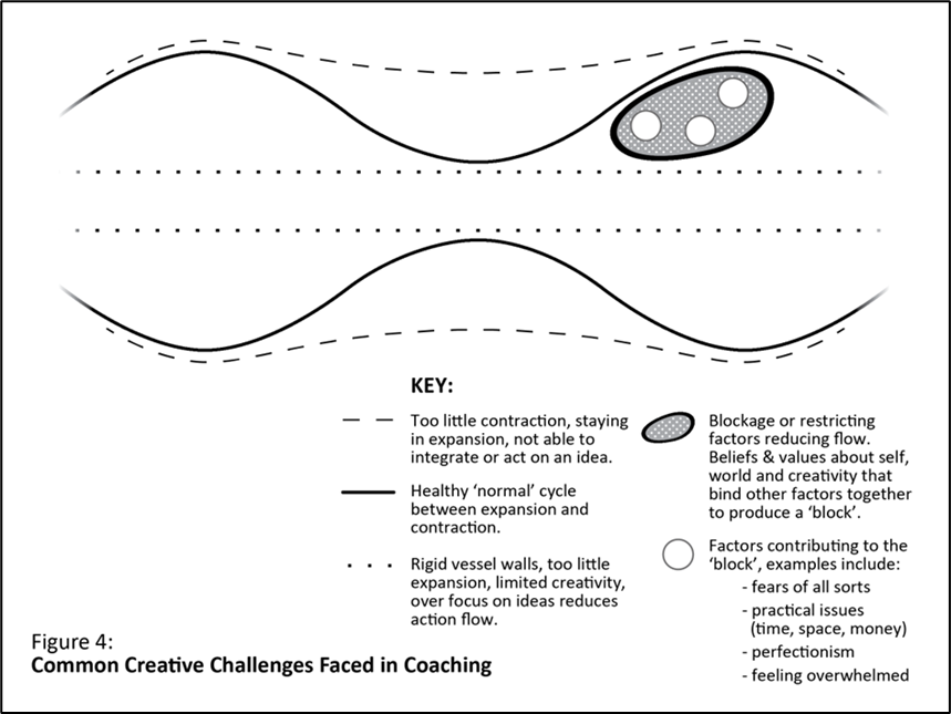 This first diagram shows the most common challenges that affect creative flow. These include: “blocks” and the factors, both psychological and physical, that contribute to the block; over focus/rigidity and lack of flexibility; too much flexibility and lack of focus; lack of integrating ideas. If these concepts don’t make sense, do make sure you watch the video called “waving hands” The diagram below represents this model in its basic form: